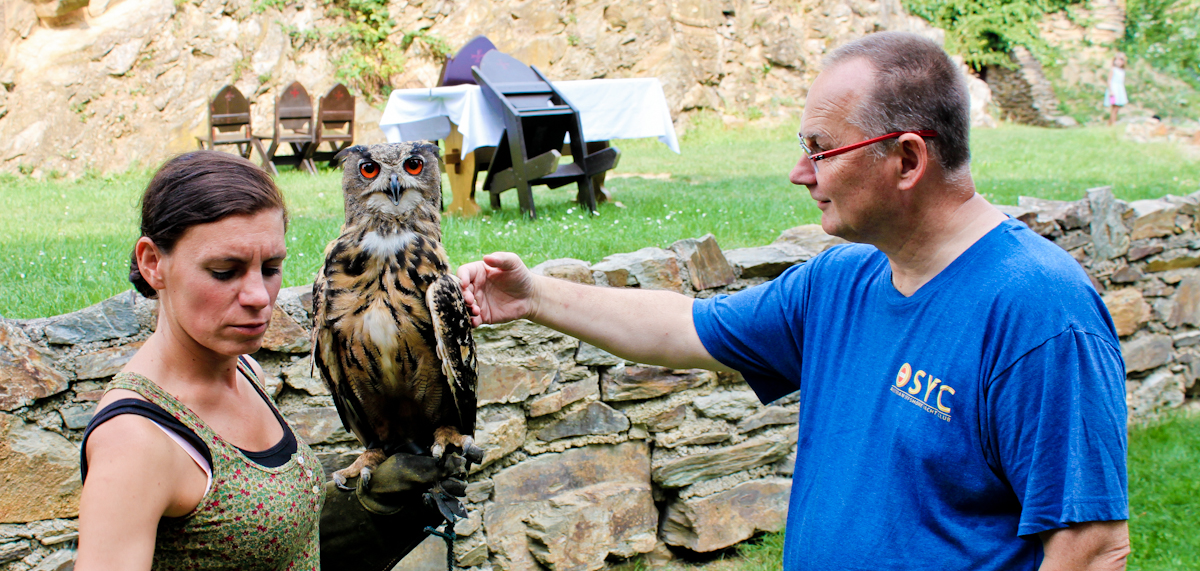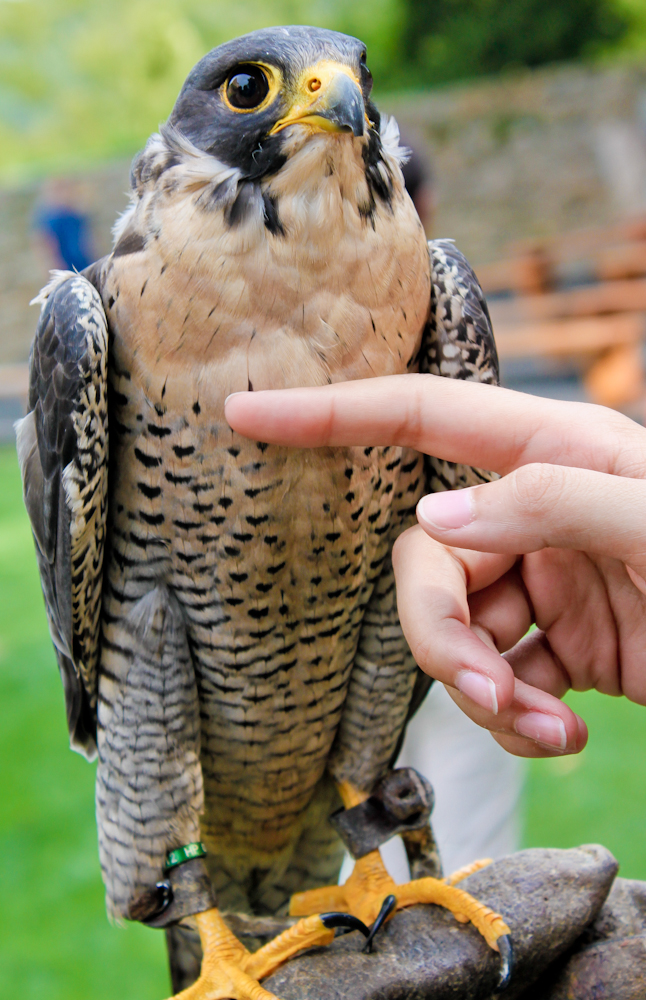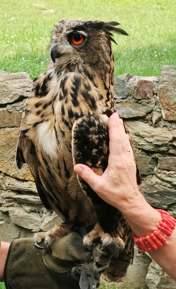 Vor Ort erwartete uns eine Greifvogelschau. Dabei durften wir die Vögel auch angreifen und streicheln. Heißen die deshalb vielleicht Greifvögel? Dort erfuhren wir einiges über das Privatleben von Falken und Uhus.