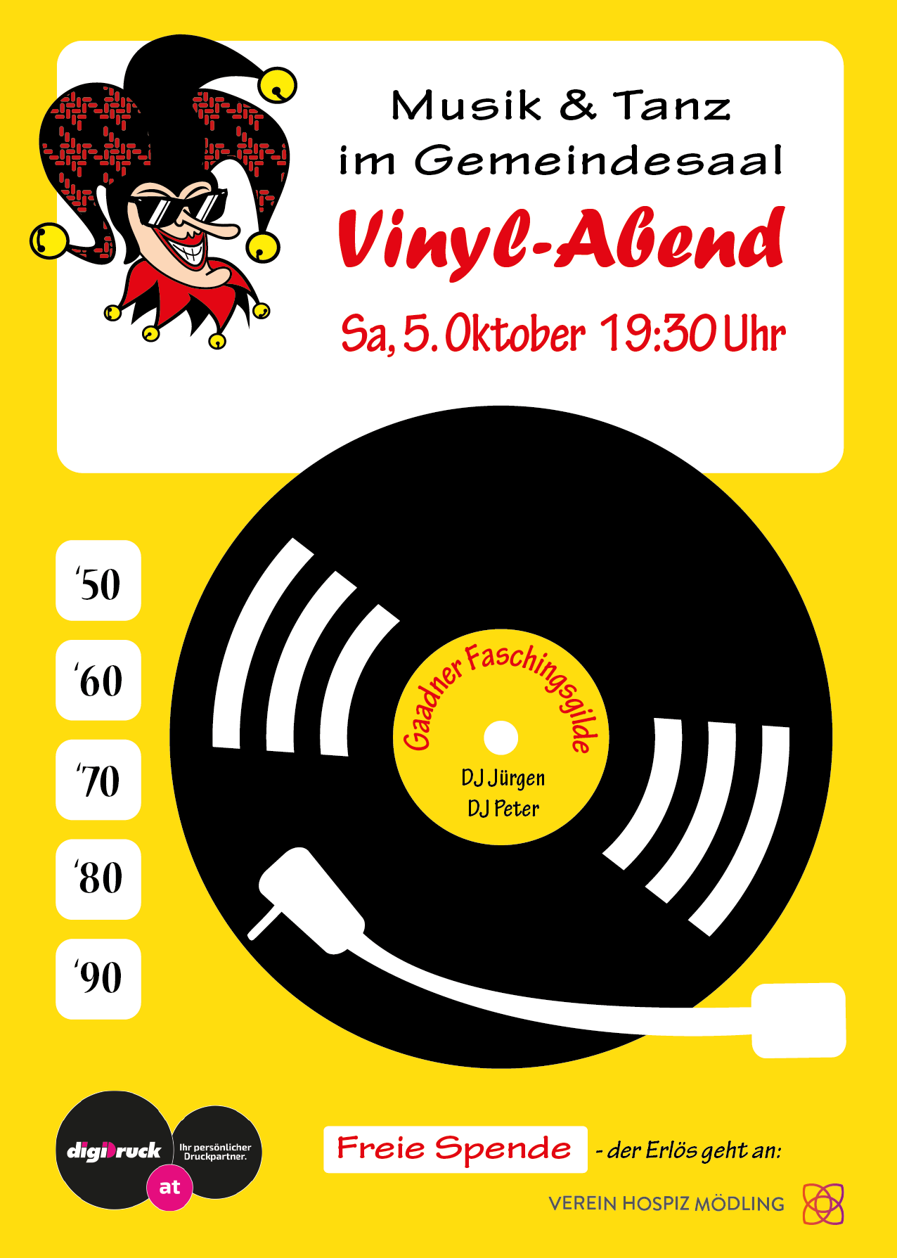 Am 5. Oktober ist es soweit – die Gaadner Faschingsgilde lädt zum Vinyl-Abend in den Gemeindesaal ein!  Ab 19:30 Uhr kann man zu Musik der 50er, 60er, 70er, 80er und 90er Jahre, tanzen, plaudern oder einfach in der Gilden-Lounge chillen. Für den Sound sorgen die DJ´s Jürgen und Peter.