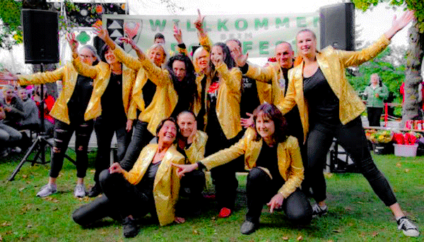 12 gold-gedresste Mitglieder der Faschingsgilde traten auf und performten schwungvoll zu Waterloo / Abba. Dann, eine geschmeidige Werbeansage von Sidi und Markus, mit der der Vinyl Abend am 5. Oktober , Gemeindesaal Gaaden, beworben wurde.
